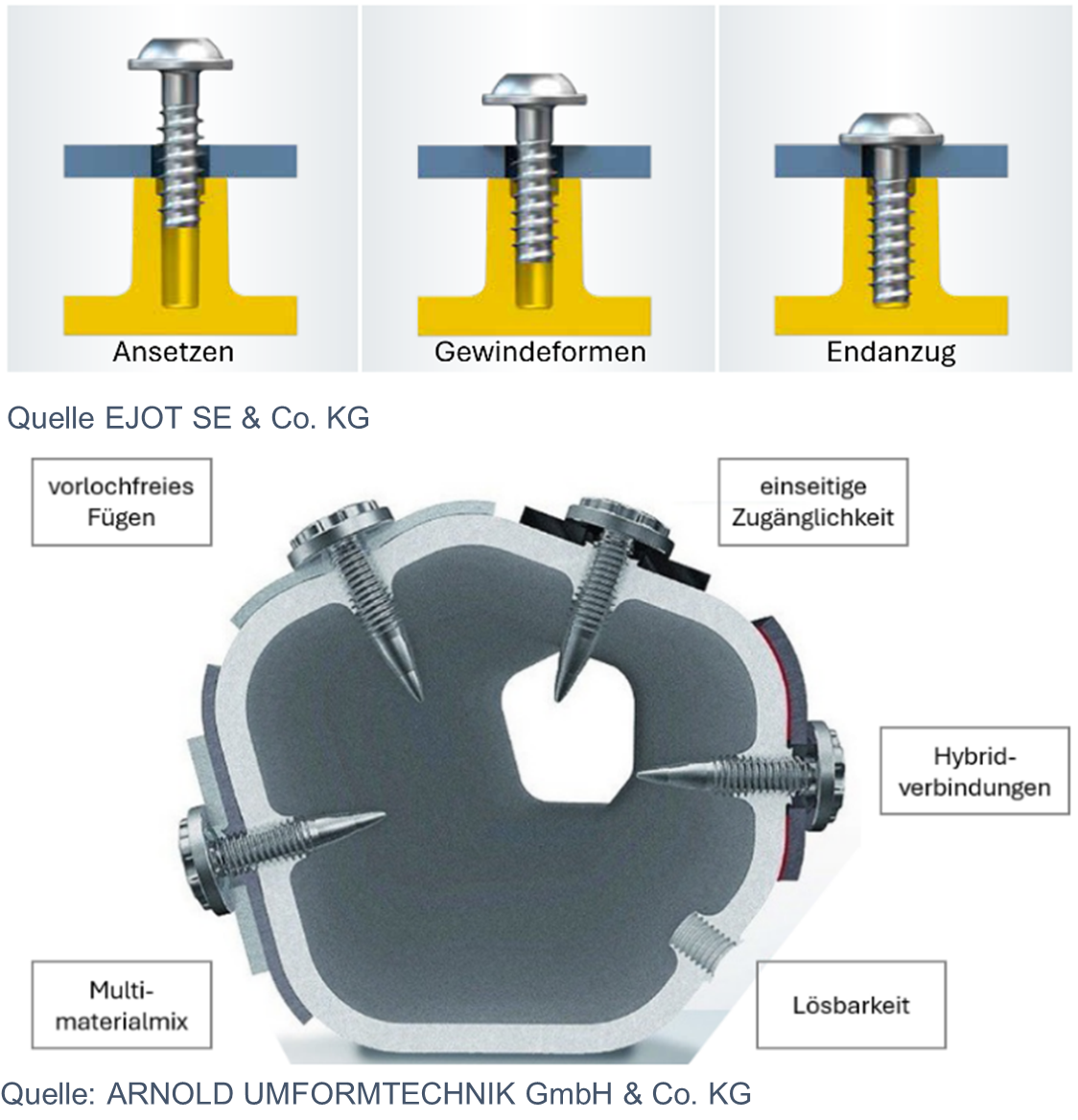Schrauben- und Schraubgerätehersteller gehen auf die technologischen Grundlagen sowie die Herausforderungen von Direktverschraubungen in Stahlbleche, Nichteisenmetalle und Kunststoffe, die Verfahren sowie die dafür notwendige Schraub- und Messtechnik ein.